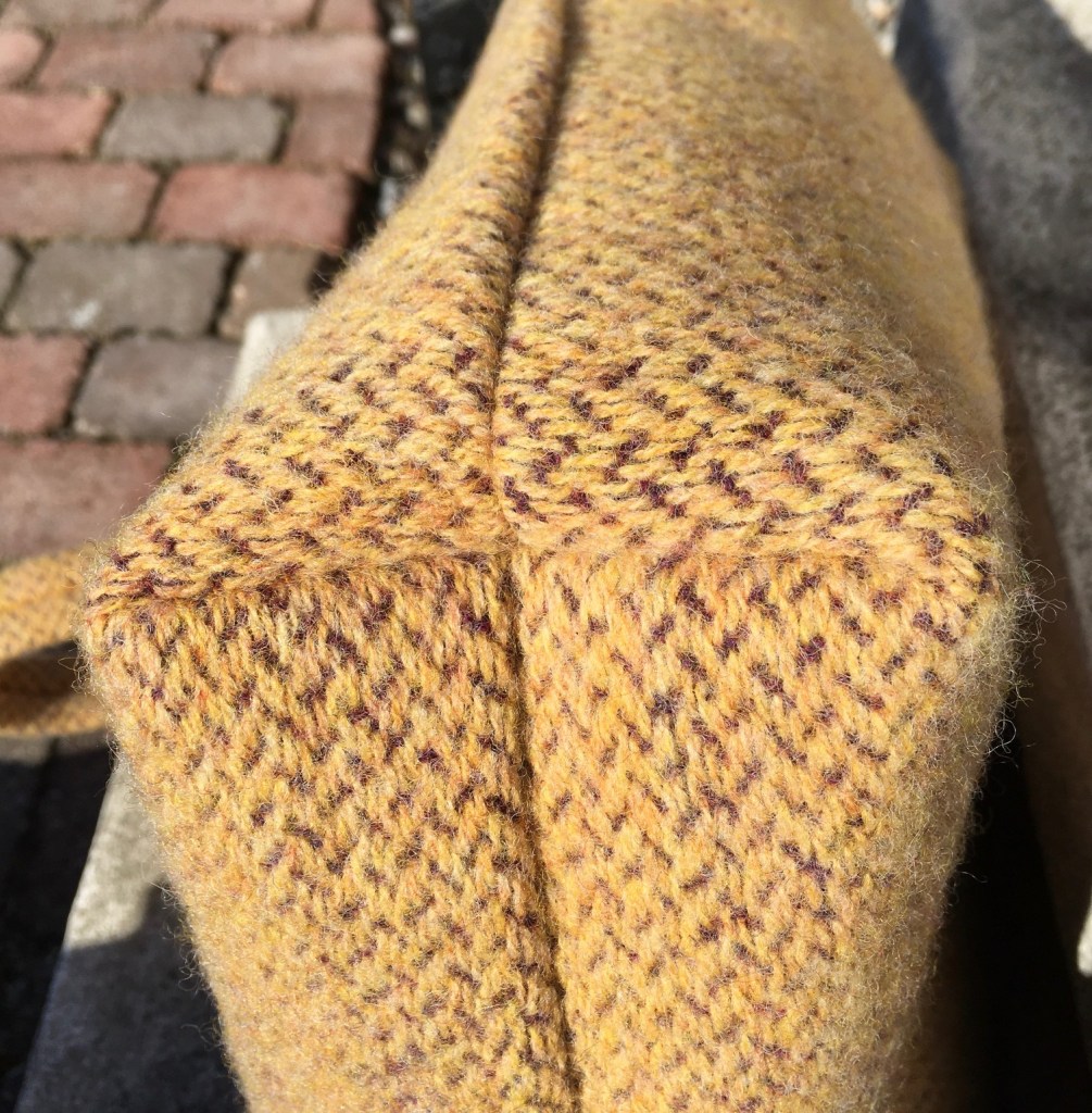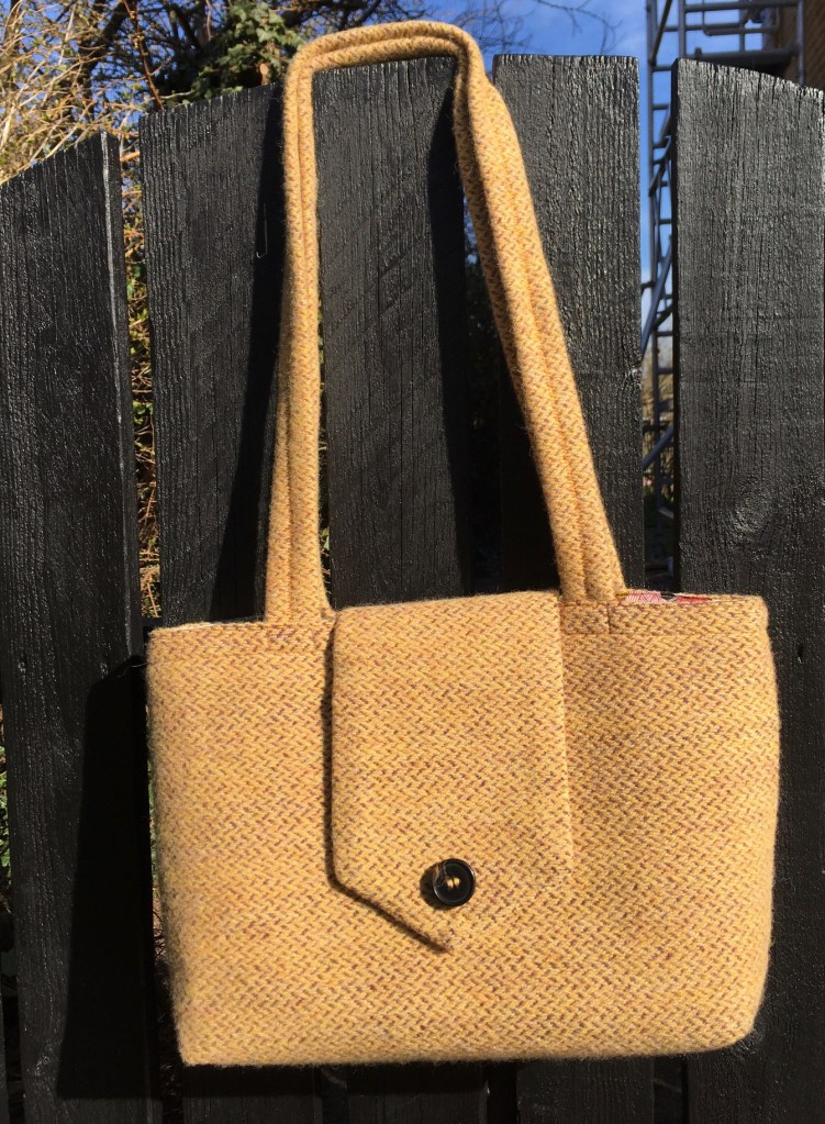 “Press Tweed” tasken er vævet 100% ren ny Shetlandsuld, og derefter valket. Efter denne behandling er ulden vandafvisende. En slidstærk og rummelig (27 x 40 x 11 cm) taske med et humoristisk twist. Tasken er NEDSAT til 1900 kr. Fås også i en lilla variant med gult for.