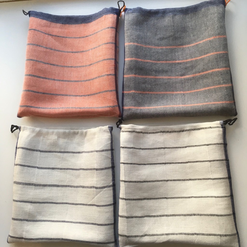 Vendbare poser i 50 % bomuld og 50% hør. Mål ca. 24 x 26 cm. Brug dem til alt det, du plejer at bruge plastposer til. Et lille strikketøj, opbevaring af gulerødder, løg og kartofler, skiftesko, gavepose – whatever. De kan vaskes ved 60 grader igen og igen. 1 stk. 200 kr, 2 stk. 375, 3 stk. 525 kr, 4 stk 700 kr.