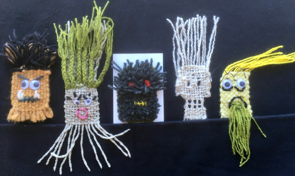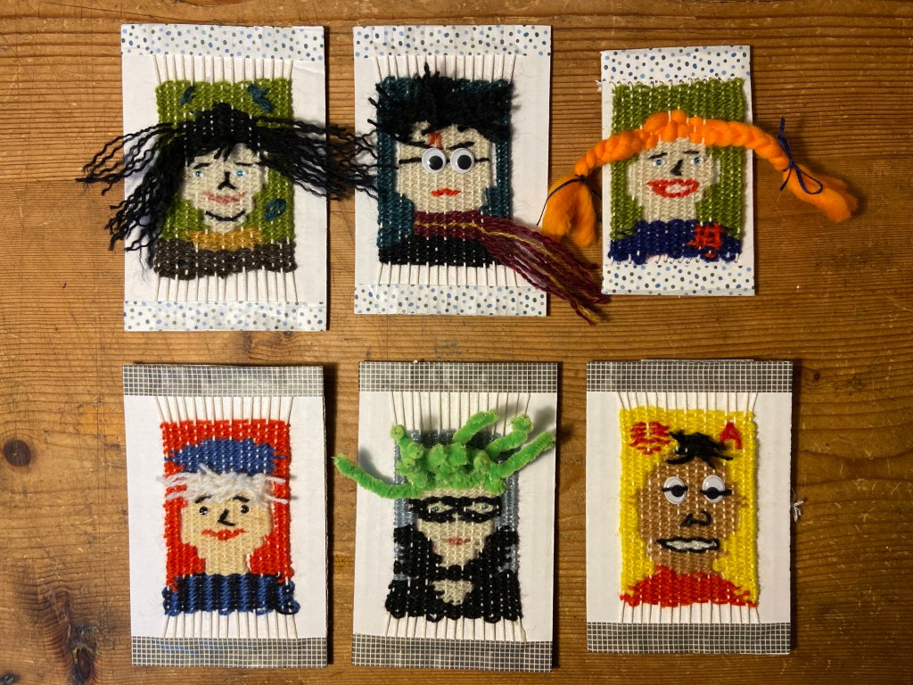 2021 var et rimelig travlt år for mig, i hvertfald i de perioder, hvor der ikke var lukket ned. Jeg har været rundt på mange børnebiblioteker, især med “Væv en sjov børnebogsfigur”, og det har givet mig lyst til udvikle denne nye workshop, hvor man ikke bruger tiden på at væve ben og arme, men hvor ansigtsudtrykket er i fokus. Hvor figuren ikke nødvendigvis behøver at smile, men hvor alle følelser kan komme til udtryk. Hils på de første figurer i serien: