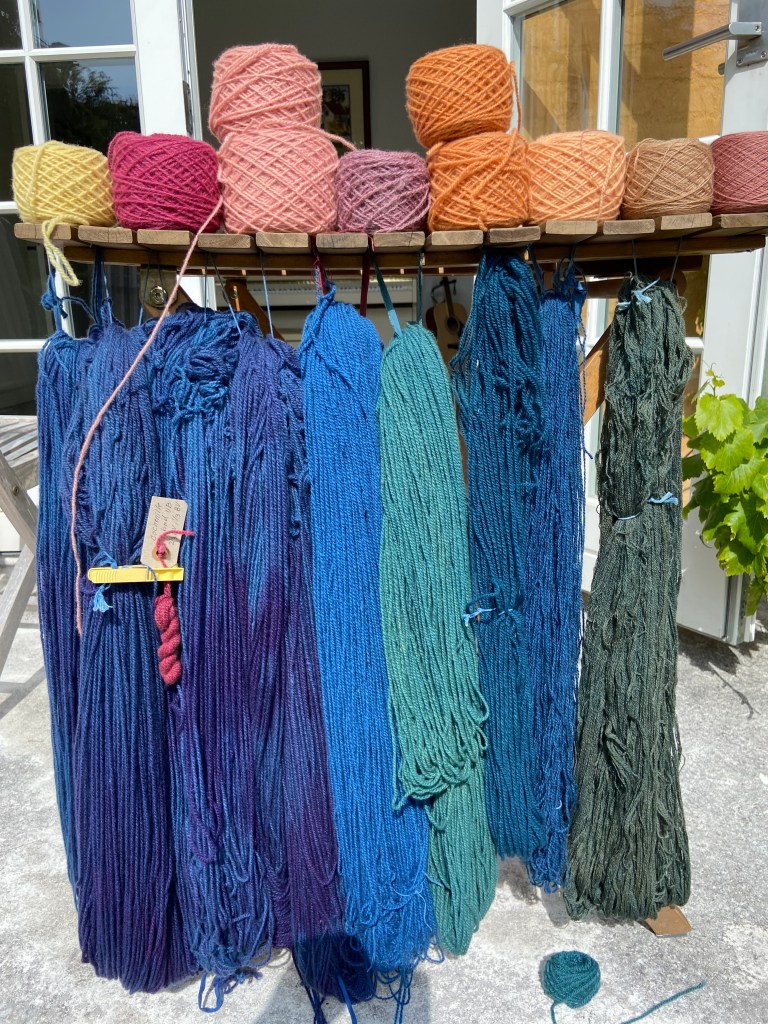Plantefarvning tager tid. Mit årshjul siger at jeg har tid til at plantefarve i august. Jeg havde afsat en uge, men det tog 14 dage, dels fordi vejret var skod, dels fordi fandt ud af at jeg ville overfarve noget af garnet. Først gør jeg garnet klar, der skal fire løse ombindinger om hvert fed. Så skal det koldbejses. Det står udenfor i 2-3 dage og passer sig selv, bortset fra at jeg lige skal røre rundt i det, når jeg kommer forbi. Indsamling af planter, koge plantesuppe, lade den køle natten over. Farve garnet i suppen, lade det køle natten over. Derefter vaskes garnet, hvis det da ikke skal overfarves, fordi man vil have en anden nuance eller farve, same procedure. Når det er tørt vindes det op og er endelig klar. Man kan ikke forcere processen. Heldigvis var det ikke kun garn til workshoppen jeg farvede. Der skulle også gerne komme en sweater ud af det, på et tidspunkt. Hvorfor gider jeg? For glæden ved at indsamle materialer i naturen. Det er antistress. Fordi det er sjovt, og man får nogle overraskelser undervejs. Man bliver hooked og lærer hele tiden nyt. Farveskalaen på plantefarvet garn er bare lidt mere lækker, synes jeg. Og så ved jeg, hvad der er i.