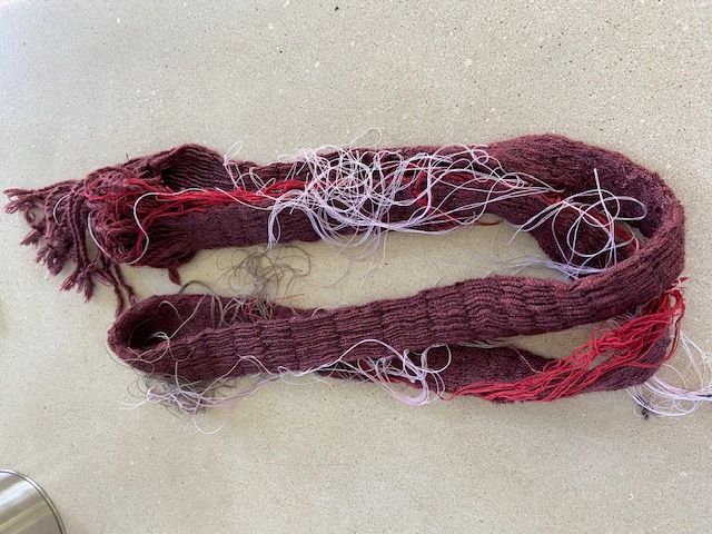 Så en tur i farvegryden med cochenille natten over. Først når garnet er helt tørt, må trådene klippes op. Her må man ruste sig med tålmodighed.