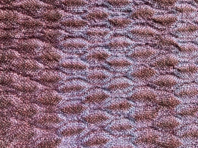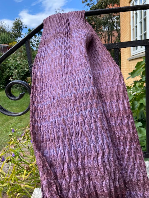 Det færdige tørklæde blafrer i sommervinden. Jeg er vild med den 3D-agtige tekstur, mønstret og farverne.