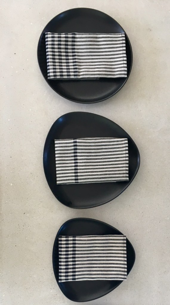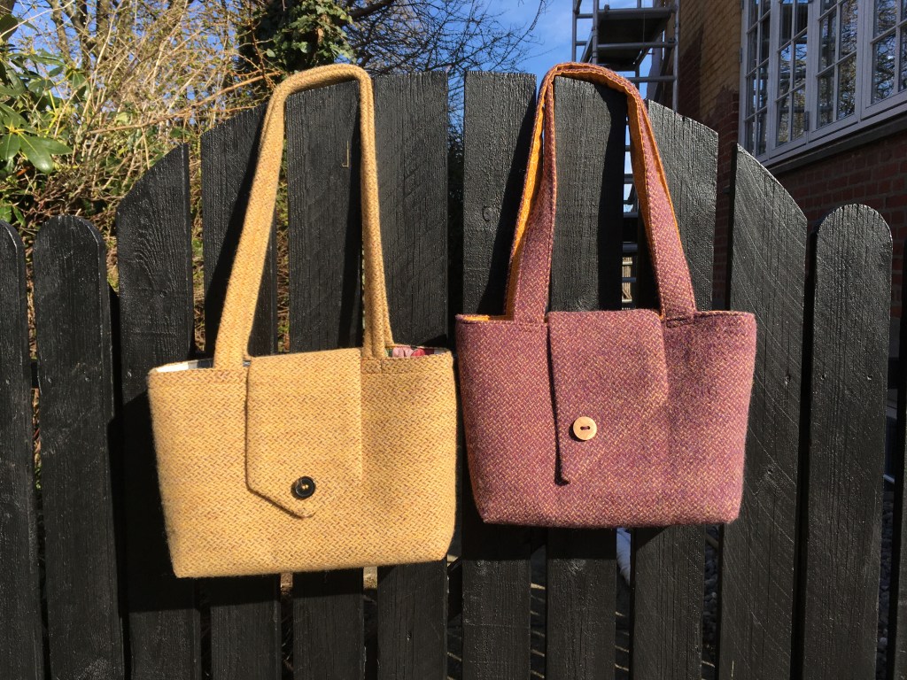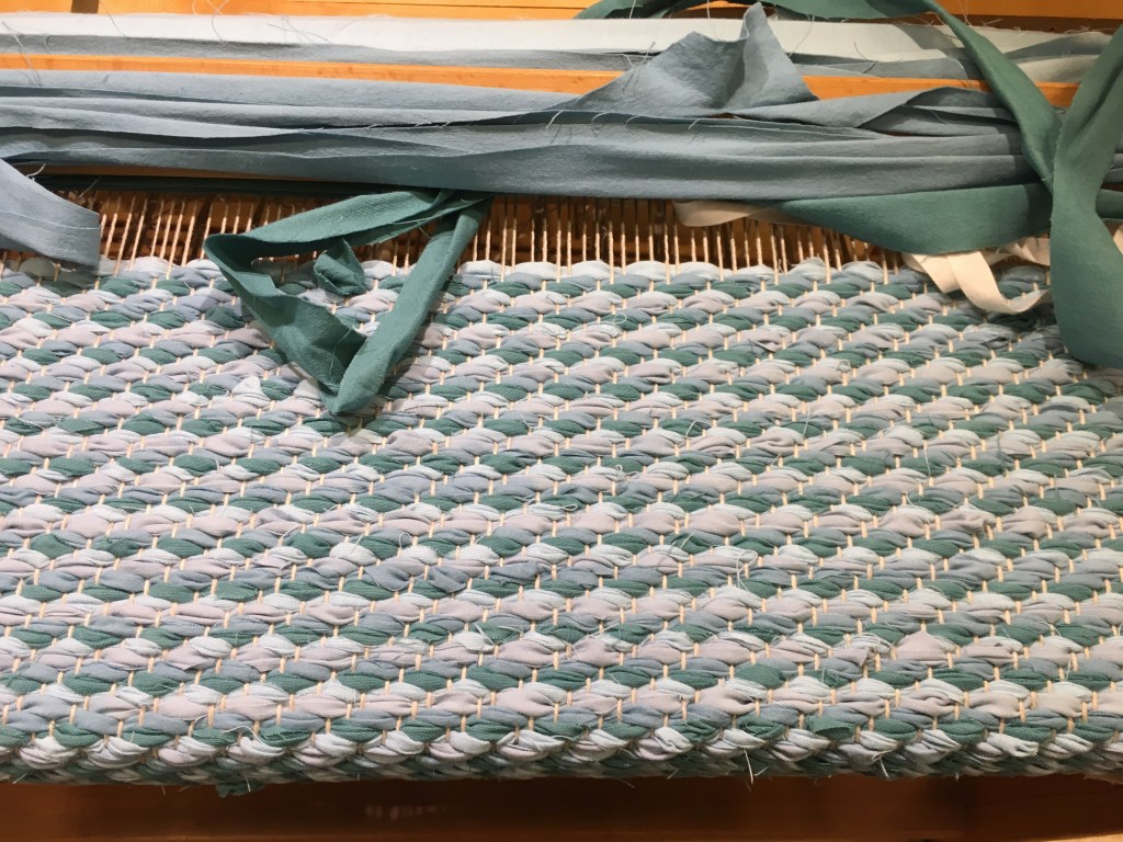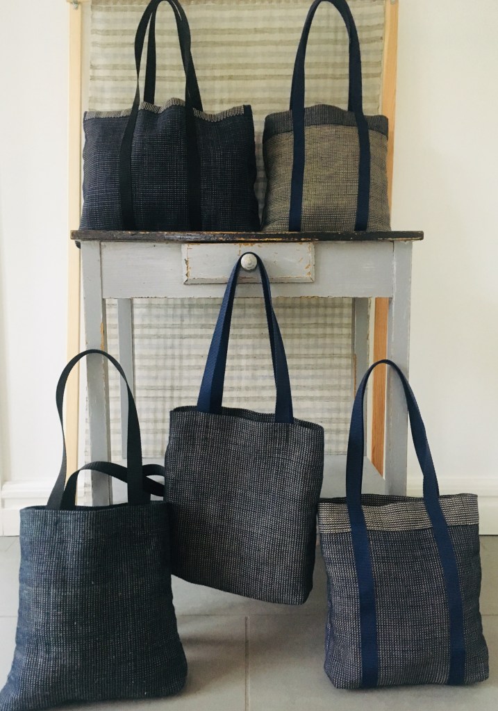 Et par tweedtasker med plads til bøger, pc og hvad du ellers har brug for. Vævet af Shetlandsuld.Disse posetasker i bomuld, hør, papir og silke var solgt næsten inden jeg fik dem af væven.Bløde teatowels i hør og bomuld. Vægtæppe frisk fra væven. Det skal ligge en uges tid, før det har sat sig helt. Derefter flettes kanterne.Disse mundservietter vævede jeg for et par år siden. De har været i brug hver dag siden og er nærmest uopslidelige. Vaskes v. 60 grader, lettere kan det ikke være. Bomuld og hør.,Der er fire blågrønne nuancer i dette kludetæppe, derfor var der fire skytter i gang samtidig, Så det var bare med at holde styr på dem. 😉 Der ligger et stort forarbejde i at væve kludetæpper: Slidte lagner i store mængder farves og rives eller klippes i strimler. Strimlerne sys sammen inden vævning, det giver det pæneste resultat. At man kan købe sådanne tæpper for en slik, beror på underbetaling af folk i Asien og andre steder, hvor arbejdskraften er billig, og hvor man ser stort på arbejdsmiljøet.